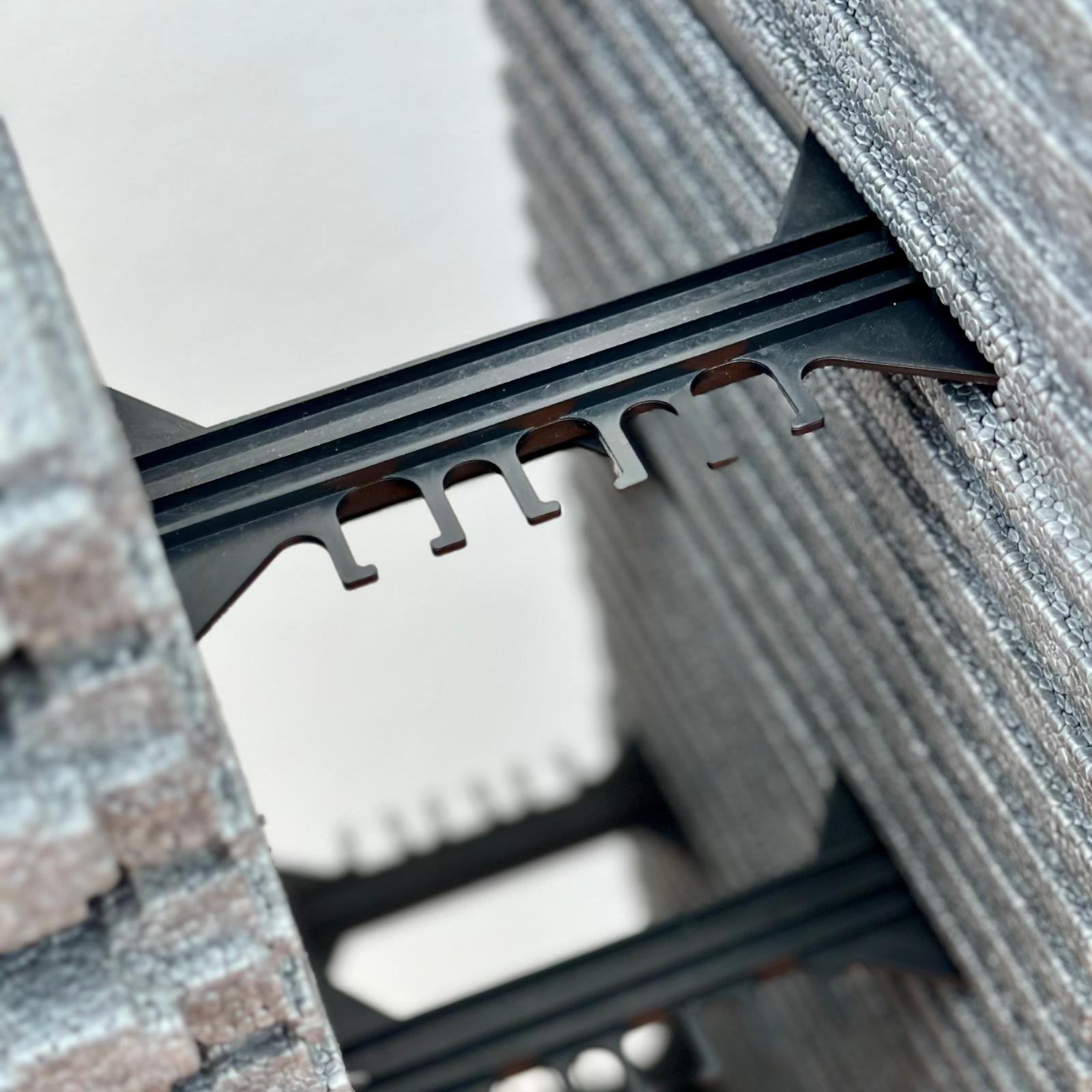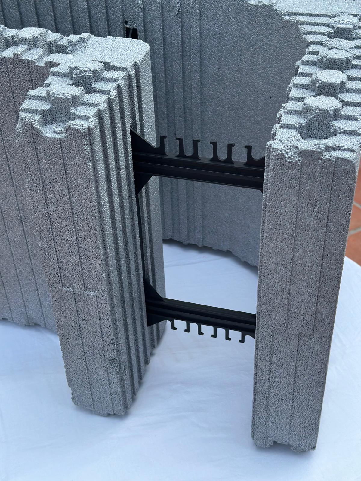 It is based on two panels of Expanded Polystyrene, joined together by high density recycled PP spacers, indented on the outside by the deeper grooves in the Polystyrene. The PP inserts (a) lock both the panels in place during concrete pour (b) maintain the steel reinforcement bar securely in place (c) provide a reinforcement within the panel to fix drywall panels rapidly with scews.
